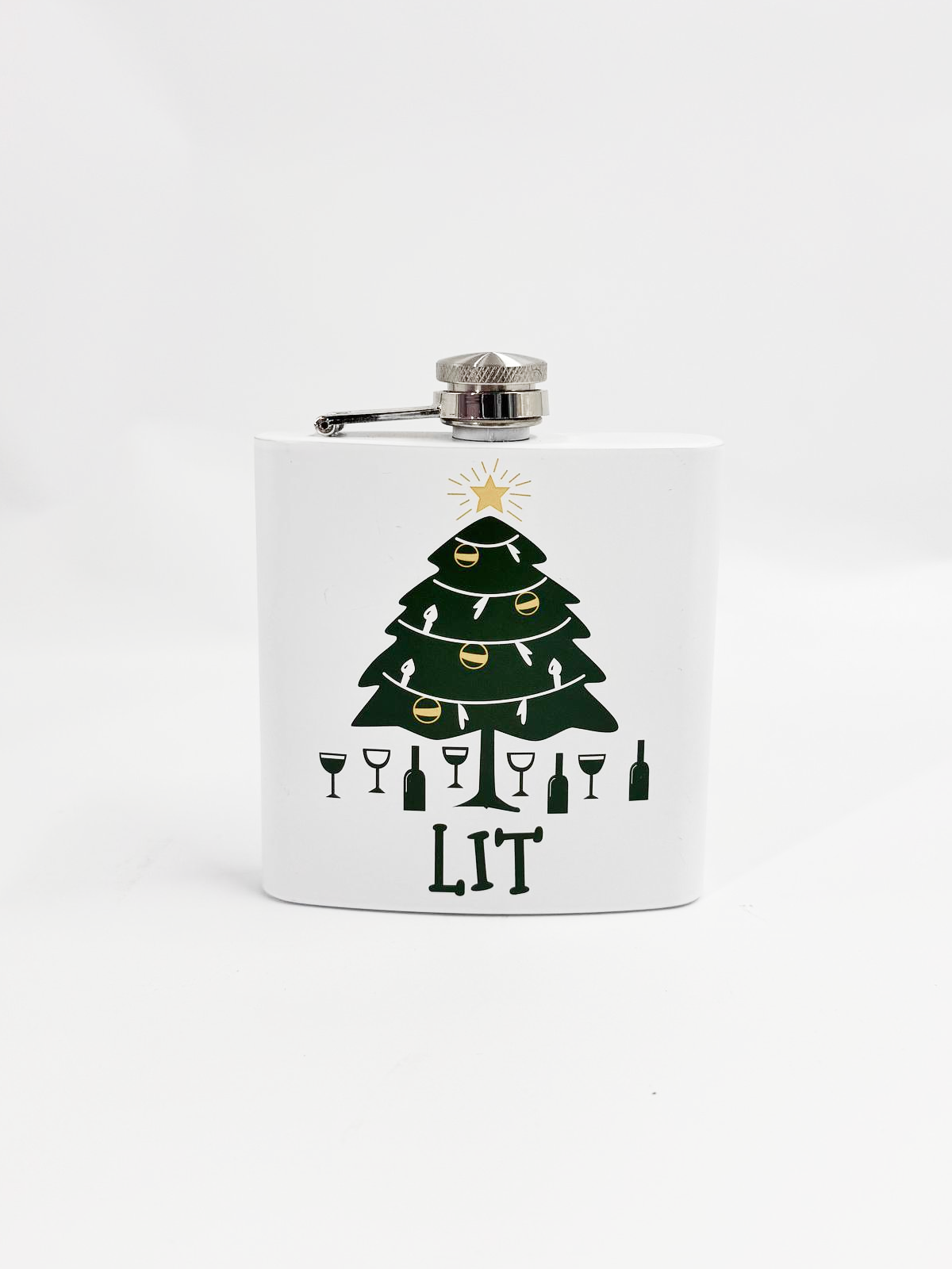 This festive flask collection features playful holiday-themed designs with humorous graphics and text.